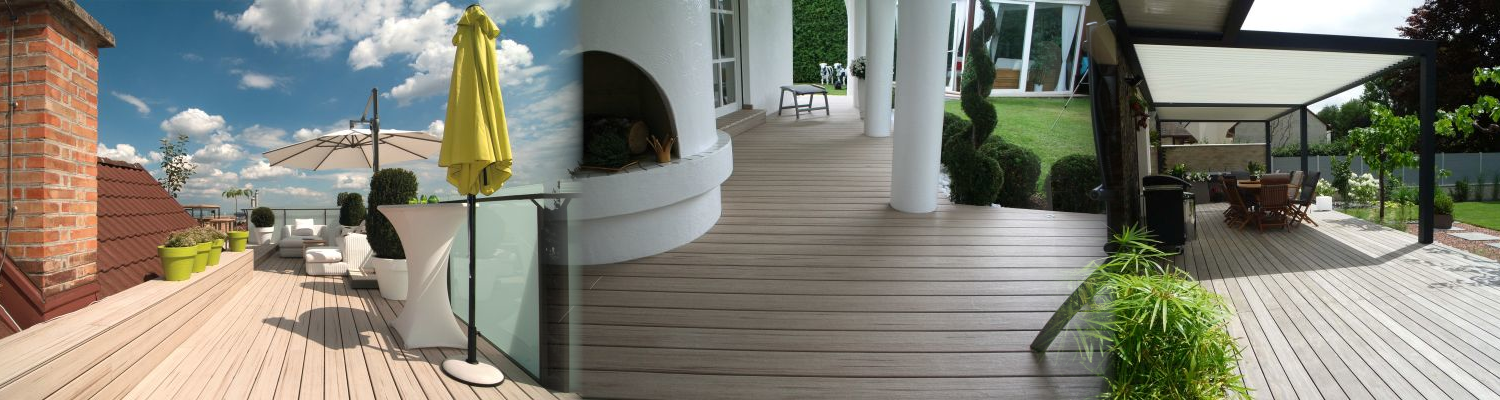 Ein Urlaubsgefühl das ganze Jahr lang mit einem Terrassenboden oder Balkonboden aus Massivholz (Naturwerkstoff) oder mit einem Holz-Polymer-Werkstoff (WPC – Natur nachempfundenem Werkstoff) oder aus Aluminium.